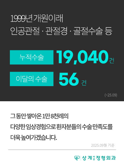 저희 상계바론정형외과는 1999년 10월 개원이래 환자를 위한 사랑과 정직한 진료를