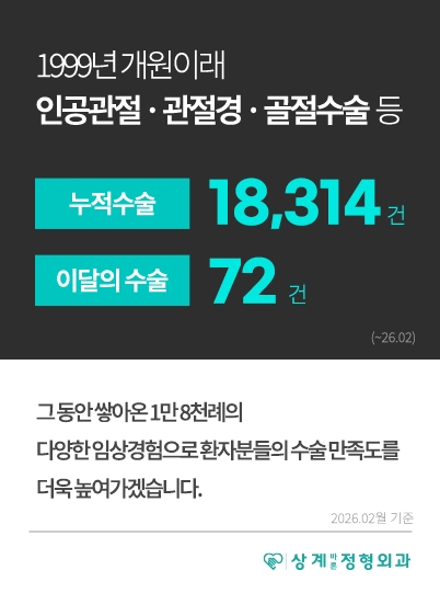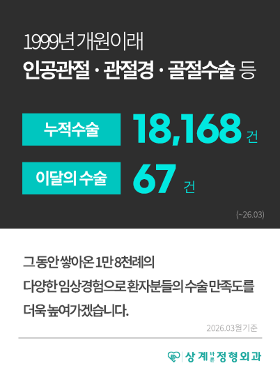저희 상계바론정형외과는 1999년 10월 개원이래 환자를 위한 사랑과 정직한 진료를
